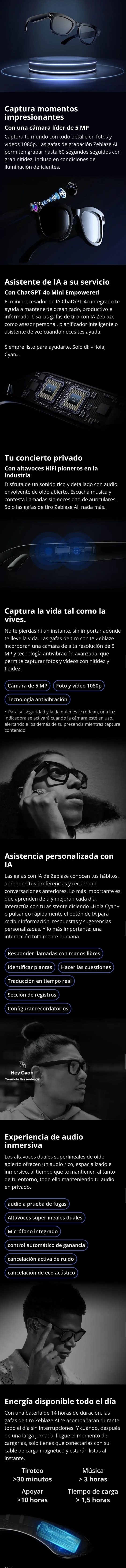 - 📹 Grabación de vídeo 1080p - 🧠 Asistente ChatGPT-4o mini - 🎤 Micrófono para llamadas - 🎵 Reproducción de Música - 💾 32GB de almacenamiento - 🔋 Batería Recargable 14 horas - 📱 Compatible Android y iPhone